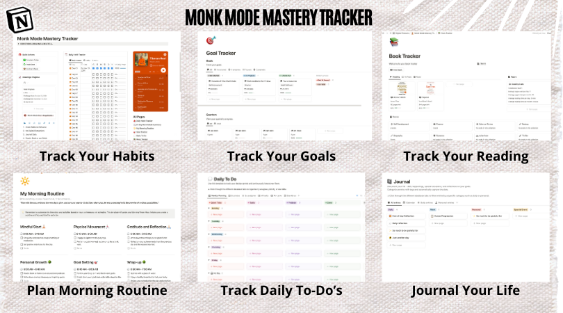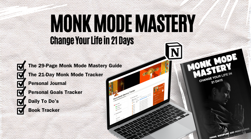 Alongside the guide, you’ll receive the Monk Mode Mastery Tracker, a comprehensive Notion template designed to support and track your transformation: